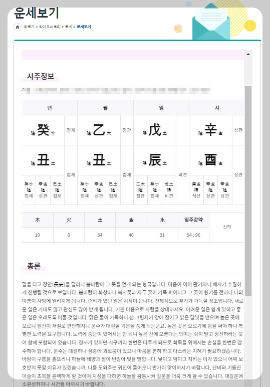 이곳의 장점은 한 번만 이름 생년월일 태어난 시간을 입력하면 운세보고 토정비결을 봐도 추가로 입력할 필요가 없습니다. 은근히 메뉴 변경해서 조회할 때마다 새로 입력하는 다른 사이트에 비하면 편하다는 장점이 있어서 강추드립니다.