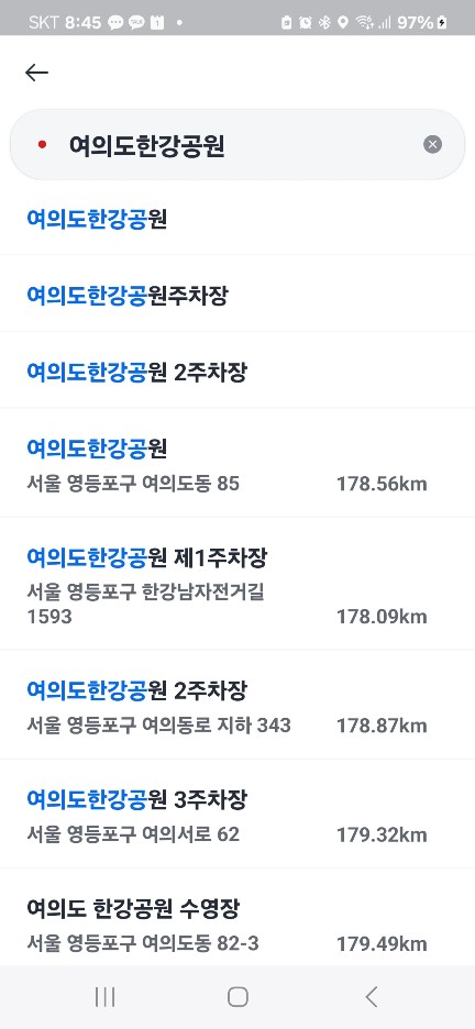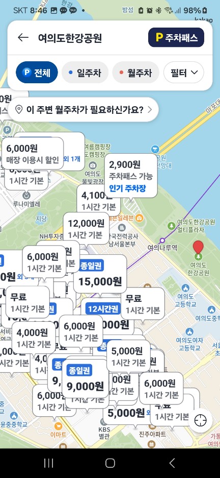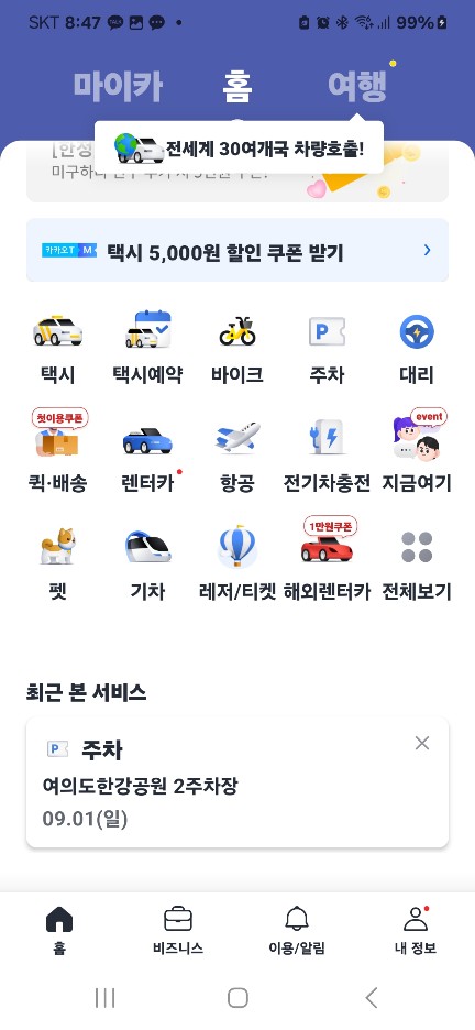 카카오 T설치가 완료되면 주차 메뉴를 클릭해서 원하는 지역의 주차를 확인하시면 됩니다.